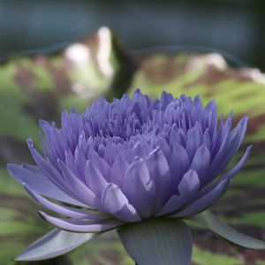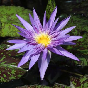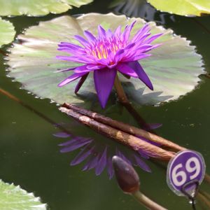 神代植物公園の今春入った💜熱帯スイレン 💜タンザナイトNo.69💜 花は宝石のタンザナイトのような濃い紫色 本来の花弁数は50枚を超える大変豪華、葉には赤茶色のストライプがはいる