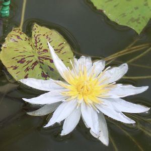 神代植物公園の今春入った🤍熱帯スイレン 🤍ミセス・E・ホワイタッカーNo.67🤍 花は開花初期はごく薄い青色だが、日を追うごとに退色し、開花3日目以降はほとんど白色となり、雄しべの先にも白が入る スターリリーと呼ばれる品種の一つで、細長い花弁が大きく広がる