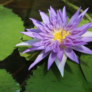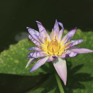 神代植物公園の今春入った熱帯スイレン 💙ブルームーン💙No.74 花は先端が青紫色で中心部は淡い黄色、花弁は細長く枚数も多い大輪種