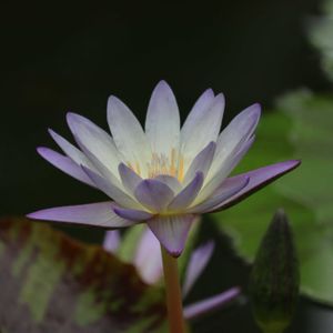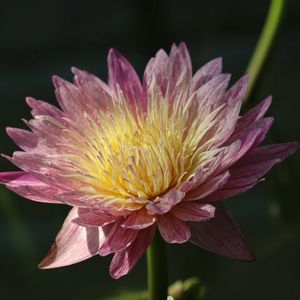 神代植物公園の今春入った熱帯スイレン 💙ブルームーン💙No.74 花は先端が青紫色で中心部は淡い黄色、花弁は細長く枚数も多い大輪種