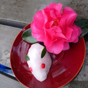 朝母をデーサービスに送る為玄関を 開けたら足元が濡れてる💦 雨かと思って顔を上げると すこぉし雪が積もってた☃️ 雪うさぎを作って遊んだBBA🐇 山茶花が色を足す♥ 2⃣ワイヤープランツも雪化粧❄ 雪は昼前には溶けました🍀
