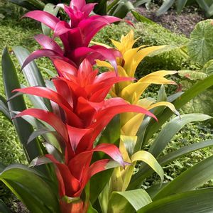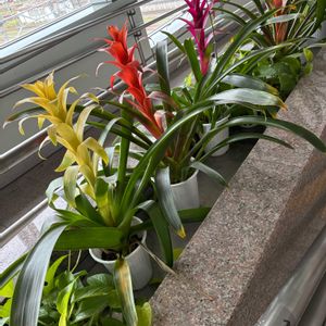 赤、黄、薄紫の トロピカルな植物🏝️ "グズマニア" 毎年、駅に降り立った観光客、帰省客をお迎えしています🚃 艶のある細長い葉っぱは四方に広がり🌿 花に見える部分は、花苞と呼ばれる葉が変化したもの💐 実際の花は花苞の中央に小さく咲きます🥰 意外にも着床植物だそうで😄 アメリカの熱帯地域の樹木の幹や岩肌に着床しています🇺🇸 葉が筒状に重なり合って水を溜め、そこから水分を吸収するユニークな仕組み💦 パイナップル科🍍グズマニア属 園芸種として栽培 Wikipedia 参照 2025.08.03 しばらく投稿はお休みします (๑>◡<๑)🤚