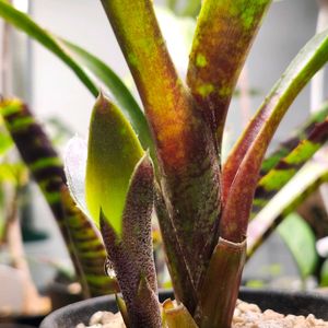 ネオレゲリア リリープー? だったはず。 子株が出てきたのには気付いていたが、ここのところ急激に成長中。 まだ真冬なのに元気なことである。 この子株、我が家初のネオレゲリアの孫株にあたる。 絶えずによくぞ育ってくれて、ありがたい限りだ。 結構放置したので親は間延びしてしまった。