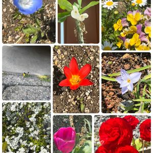 今日はもう1枚 初夏の様な陽気でたくさんの花たちが咲き始めました☀️ 時計回りに↖️から <ネモフィラ> まだ雪の降る寒い時期から畑に植えられて縮こまっていたネモフィラちゃん。暖かくなって可愛く咲いています🥰 <ハナキリン> 玄関の窓の明かりで頑張るハナキリンさん。 明るい方を向いて咲いていたので、気が付かずにいました💦 <ノースポールとビオラ> 畑の隅っこで可愛く咲いています。 奥の方にムスカリちゃんが写っています😆 <チオノドグサ> 春になったなぁと感じるお花ですね♪ <ラナンキュラス> 今年お迎えした真っ赤なラナンキュラスちゃん❤️ 花数も増えて、燃える様な赤が素敵です😘 <チューリップ> 春の定番チューリップちゃん🌷 何色が咲くかお楽しみ〜の球根を植えたけれど、この子がたくさん咲いています😅 <ユキヤナギ> 毎年ポツリポツリとしか咲かなかったユキヤナギさんが今年はその名の通り雪のように咲いています❄️ <ビオラ> よ〜く見てください! 車のタイヤが見えますか? 我が家の駐車場のコンクリートの隙間に咲いています。 毎年、えっ!なんでこんな所に⁉️ と思うようなところで咲くビオラ、まいちゃん 相変わらずど根性です🤣 中央<チューリップ> この子は原種チューリップ? 植えたことさえ忘れている💦 でも、2ついるから植えたんでしょうね😆 いよいよ、春の花の競演が始まりましたね❣️