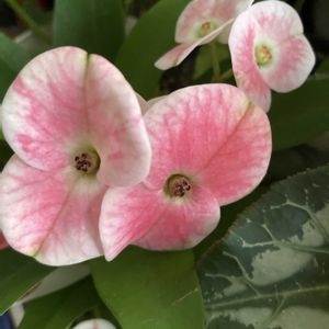 トゲなし花キリンが咲きました 寒さを避けて室内に取り込んでいたのであまり日が当たらず、うすいピンクの縁取りの可愛らしい色になりました 夏、日光を浴びて濃いピンクになったお花も素敵ですが、今の薄い色のこの子も大好きです