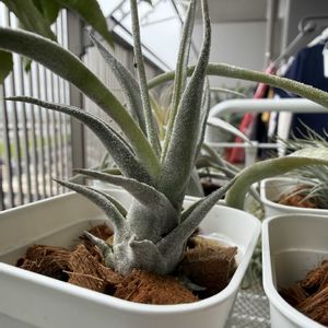 チランジア色々 昨日の雨の中で一日中ベランダで過ごさせたら吸水しきってぱんぱん ストレプトフィラやディグエティは予想通りだったけど、ドゥラティも水で広がるんだね 掴ませた枝を離しそうになってる 台風の時はケアしないと飛んで無くなっちゃうかも