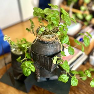 ウチのグリーンたち、今年はみんな無事に長い夏を越えてくれました。 イイ季節になったので、株分けしたピレア ヌンムラリフォリア(右)と新入りのフィカス プミラ サニーホワイト(左)さんをブリキの鉢と飾り台にセット! かわいいだけじゃない感じになっとる!