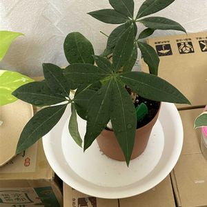 ダイソー産実生パキラちゃんが何やら喜んでいるようです。😃 6枚葉の新葉🌿🆕をだしてます。 このコの場合、具合がいいといつもの5枚葉ではなく、6枚葉を出してきます。 冬は2年連続ハゲちらかして、今は新葉2枚🆕🌿🌿になってます。 新葉が出るまで、5分の1枚だけしか残っていませんでした🥲。 冬にハゲちらかすのやめて欲しいな。何が悪いのでしょうね😭