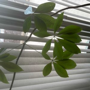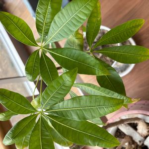 ダイソー産実生パキラちゃんが何やら喜んでいるようです。😃 6枚葉の新葉🌿🆕をだしてます。 このコの場合、具合がいいといつもの5枚葉ではなく、6枚葉を出してきます。 冬は2年連続ハゲちらかして、今は新葉2枚🆕🌿🌿になってます。 新葉が出るまで、5分の1枚だけしか残っていませんでした🥲。 冬にハゲちらかすのやめて欲しいな。何が悪いのでしょうね😭