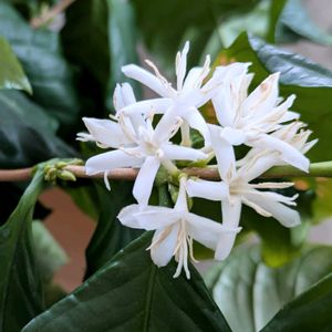今年は何度も大雪⛄️に見舞われている札幌💦もう最後にして欲しいです〜😱 コーヒーの木 1️⃣お花が咲きました💚 いくつかの蕾が束になって咲き、ボリューミーです いい香り〜😆✨️ 2️⃣花芽があちこちの枝から出て、全部実になればいいなと期待しています😊 3️⃣蕾が硬くて開くのか心配になったので、ちょっとほぐしてあげたら全部咲きました🎵 緑の実がなって赤くなるのは9ヶ月位先なので待ち遠しいです コーヒー飲めるといいな☕💕