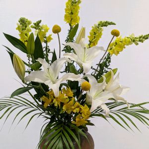 今回は“動きを表現する”というテーマでした。 とても大きなアレカヤシを丸めて、動きを表せるよう心がけました。 こんなに大きなアレカヤシをどのように使うか悩みましたが、うまくテーマに合わせて使えたかなと思います! ギリアは茎の曲がっている方向を同じ向きに揃えて、動きに一体感を出しました。 丸くて可愛らしいお花です✨