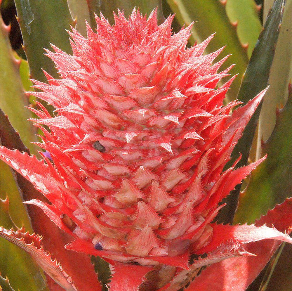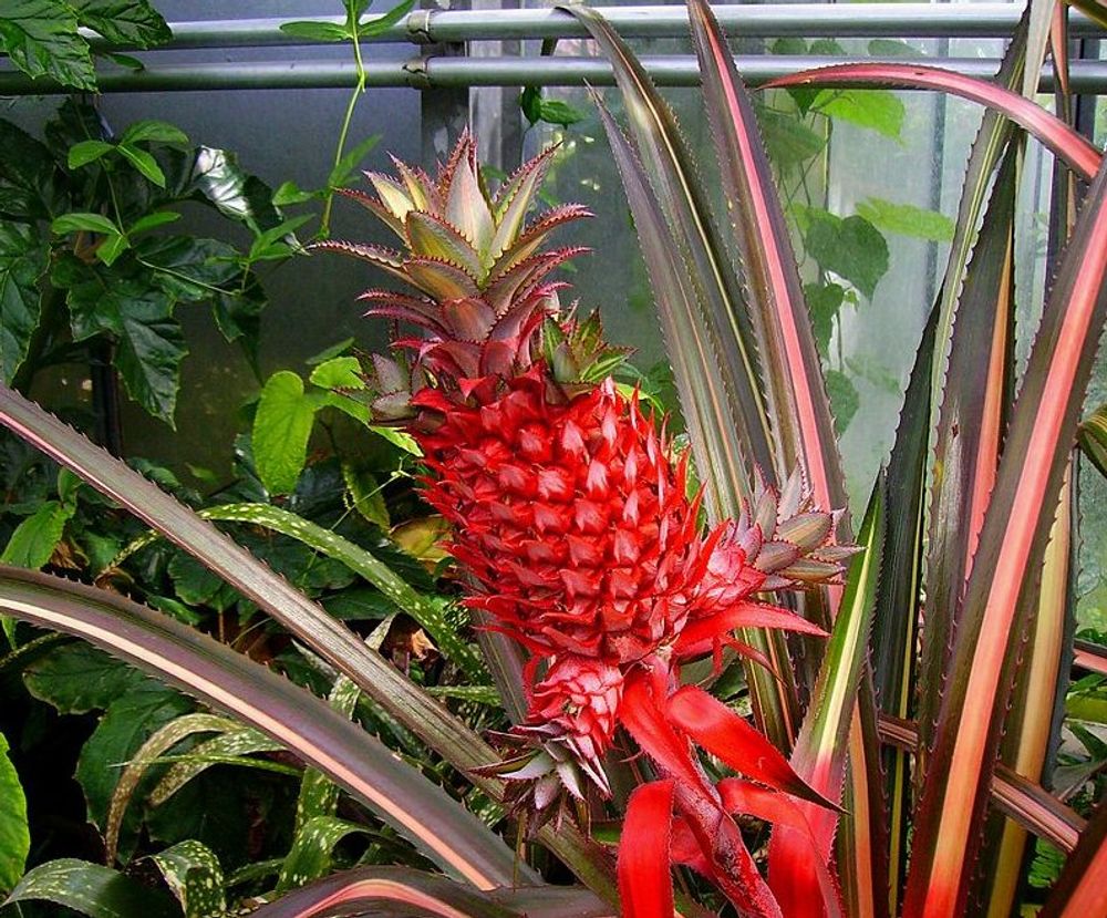 美しいカラーリーフ・プランツとして人気のアナナス・ブラクテアツスは、本当に食べることのできる果実(赤色のパイナップル!ただし普通のパイナップルよりも種が多い)がなる可能性があることも楽しみのひとつ。