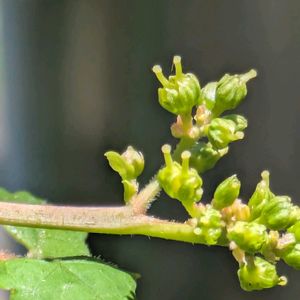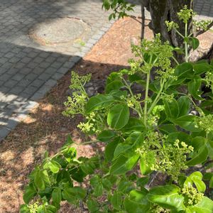 ミカン科 サンショウ属 サンショウ サンショウの雌花が咲いています 雌雄異株で、雌花だけなので実はなりませんが、たまにアゲハが花粉を運んで来るらしく、部分的に僅かに実ができたりします 葉の縁に香りの元になる油点があります