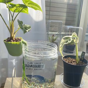 シルバーリーフが美しい フィロデンドロン ブランティアナムと 小判型の小葉のマドカズラ オブリクア エクスピラータをお迎えしました 植友さんさん情報でオブリクアの方は前々からあって、それが30%offになってるよ〜 それからスイカみたいな模様のフィロデンドロン入荷してたよ〜 つて… マドカズラは2種類あるからいいやって思ってたんだけど… ぱっと見て…そうね 徒長してるしそれなりに葉もまばら…だし これはいいや! それより スイカみたいな模様のフィロデンドロン 欲しかったブランティアナム! 入荷したてらしく 草姿も綺麗で即決! …と はじめに見ていらないかな?と思ったマドカズラの反対方向にももう一鉢下がってた こちらはそれなりにボリュームもあって良さげ ということで…2鉢 お迎え ブランティアナムは吊り鉢の吊金具?に巻き付いているけどこれから先はどう伸びるの?といった感じ 株元見ると十数本の挿し木かな? 混み合ってるところを4本ほど外してみた 1本1本はヒュルヒュルと伸びた感じだったので根っこのある根本から2節のところでカットして5本くらいをひとまとめに植えてひとまず1鉢 カットしたやつは2.3節づつのカットにして水差し こじんまりとした鉢を作りましょうね マドカズラは吊り鉢から1m以上伸びた感じなので先のほうをカットして それを挿し芽にしてリセット株を作りましょうか それぞれ水差しで発根させてから 支柱仕立てにしましょうかね 小葉のマドカズラも可愛いしシルバーリーフのブランティアナムは水差しの状態ですでに美しい