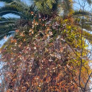 ■Washingtonia & Phoenix🌴 ・ワシントンヤシモドキ どデカくなったワシントニア。 Washingtonia filifera: 幹が太く、ワシントンヤシモドキよりも耐寒性がある。 Washingtonia robusta: 幹が細く、より一般的な街路樹として植えられている。 どっちかはわかりません。 (4-5枚目) ・Phoenix canariensis カナリーヤシ 2022年6月にうちに来たカナリーヤシ。3年で立派になりましたが、これも鉢から土に根をおろしていて、果たしてこれからどうしたものか。来春、植え替えようかなと。 植え替えるなら恐らく2つともかなり根を切らないと行けないので、その場合は、葉も落とした方が良いと思うんですが、どのくらい葉を残せばいいものか。AIに聞いたら教えてくれるんだろうか🤔 最高気温29℃、最低気温20℃ 《追記》 聞いたら教えてくれました。以下、回答。 地植えの根を切って植え替えを行う場合、ヤシの木への負担は非常に大きくなります。根を切ることによる水分や養分の吸収能力の低下を補うために、葉を剪定して蒸散(水分の蒸発)量を減らすのは、非常に理にかなった対処法です。 ワシントンヤシモドキ、カナリーヤシ(フェニックス)などのヤシ科植物は、一般的に以下の点を考慮して葉を剪定します。 ・葉を残す量の目安 基本的には、根を大きく切る場合は、葉の枚数も大幅に減らす必要があります。 1.新しい葉(生長点)は絶対に切らない ヤシ科植物は、幹の先端にある「生長点」から新しい葉を順次展開させます。この部分を切ると、新しい葉が出なくなり、株が枯れる原因になるため、**最も内側の、元気で上向きの葉(特に新芽)**は残します。 2.古い葉、枯れた葉を優先的に切る 根元から垂れ下がった葉や、茶色く枯れた葉、黄変し始めた古い葉は、もはや光合成の役割をほとんど果たさず、養分を消耗するだけなので、根元から切り落とします。 3.緑色の葉の数を思い切って減らす 根を大幅に切断した場合、残す葉の量を全体の1/3〜1/2程度にまで思い切って減らすことが推奨されることがあります。 特に大きな根を切った場合は、葉の総量を減らすことで、残った根への負担を軽減し、植え替え後の活着を助けます。 ただし、1.の生長点とその周りの新しめの葉をしっかりと残すことが大前提です。 ・作業の際の重要な注意点 トゲに注意: カナリーヤシの葉の付け根(葉柄)には鋭いトゲがあることが多いので、軍手ではなく厚手の革手袋を使用するなど、怪我をしないよう十分注意してください。 葉の切り方: 葉を切り落とす際は、幹に近い付け根のギリギリのところをノコギリや大きな剪定バサミでカットします。 切り口の保護: 特に太い枝を切った場合や、大きな株の場合は、切り口から病原菌が入るのを防ぐため、**癒合剤(ゆごうざい)**を塗布することをおすすめします。 植え替え後の管理: 植え替え直後は、直射日光の当たらない明るい日陰に置き、急激な水分の蒸発を防ぎます。 水やりは、土が乾いたらたっぷりと与えますが、根を切った直後は水を吸う力が弱いため、過湿による根腐れに注意が必要です。 植え替え直後は、発根促進剤などを与えると、新しい根の伸長を助けます。 まとめ 根の切断量に応じて、葉の蒸散量を減らすために古い葉や傷んだ葉を優先して切り落とし、健康な緑色の葉を全体の半分程度まで減らすことを目安にし、何よりも生長点(中心部の新芽)を傷つけないように慎重に作業を進めてください。
