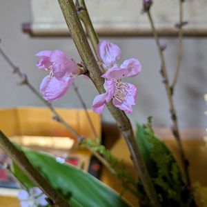 今日のお花 🩷モモ🩷 過日のフラワーアレンジメントで使用しました。 🎎お雛さまは貝と縮緬で出来てます。