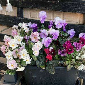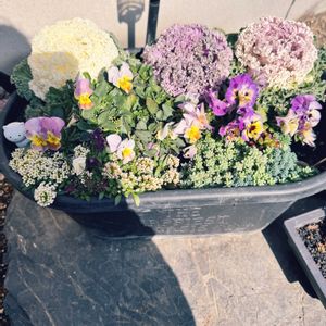 我が家の冬の寄せ植えの皆さん! バックに葉牡丹、センターにビオラ、フロントにアリッサムとMIXセダムです!このまま5月くらいまで行けると思います。セダムとアリッサムは…あとで分解したら、もっといけるかな?