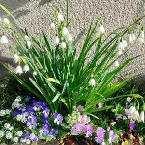 玄関門柱足元のスズランスイセンが花盛りです♪ 庭の地植えのムスカリも、色々な種類のお花が咲いています💜
