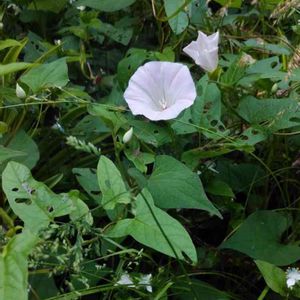 ヒルガオ(昼顔) ヒルガオ科 ヒルガオ属 6~8月 つる性 在来種 多年草 地下茎を伸ばして繁殖し、結実は稀である 葉は互生 長さ5~10cmのほこ形~矢じり形で、基部は斜め後方に張り出すが、裂けない 花径約5cmで漏斗形 雄しべ5個∶花糸の基部に腺毛・葯は白色 柱頭2個∶半円形 葉腋から長い花柄をだし、淡紅色の花を1個つける 花柄は翼が無く丸い 萼片5個を包み込むように大きな卵形の苞が一対つく 苞の先は鈍頭 繁殖力旺盛で、地下茎で広く増えます 一見たくさん咲いていても全て同じ株ということか多く、そこに自家不和合性という性質が相まってなかなか結実しているところはみられないようです
