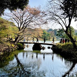 🏷️お花見🏷️ビューティフルサンデー 🏷️六義園 六義園には橋を渡る場面がありますが、橋の両端のリュウノヒゲに椿の花が置かれていて、 この演出、可愛いなぁ💕と思いました。 他の植物では、アオキの蕾と花が多かったです。 そして椿も🥰 切り株に乗せてあった椿は、来場者の遊びでしょうね。素敵でした💓