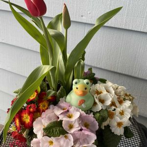 今日のお花はサクラソウ。 でセイヨウサクラソウの仲間、 プリムラ•ジュリアンでございます。 チューリップと寄せ植えになっているのを、買って来ました。 カエルの着ぐるみラバーダックちゃんと一緒🐸 珍しい色のプリムラ•ジュリアンも見つけた💕