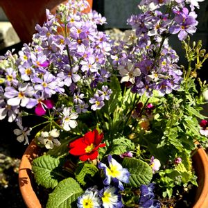 ウチ🏠の小さな庭のお花達💐 ①前にも投稿していた青い耐寒性プリムラマラコイデス『湖畔の夢』💙の寄せ植えに異変が😨⁉️ 足元に植えていた一重咲きのプリムラジュリアンですが、白地🤍に青いスジスジ💙のお花で青系統でまとめたつもりだったのに何故か赤い花❤️が顔を出してきました💦 1種類の苗🌱だったはず❗️…❓ 違う色にしてももう少し紫💜とか青系統💙の花が咲いて欲しかった〜😓…これじゃあセンス疑われるよね💦 ②どう見ても違う花❤️なんだけど、同じ葉っぱ🌿を共有してるようなんだけどなぁ?🤔 抜こうにも抜けない…😓💦 ③しかも上で咲いてる『湖畔の夢』もよく見ると濃いピンクの花🩷が一輪咲いている〜💦 ④下の方では白🤍とピンク🩷のツートンの花があったり、白地に青い⁈紫⁈のスジスジだったり…😆 もう笑うっきゃない❣️🤣 ⑤ウチ🏠のクリスマスローズさん、白いのも咲きました👍✨ コレは安定のいい感じ💓💓 ホッとします😌 久しぶりの投稿で連投してしまいました😅 こちら、寒の戻りで朝晩すごく冷え込みますが、庭の花達🌸🌼はどんどん咲いてくれています。 その様子はまた明日投稿しようと思います😊✨ ではおやすみなさい💤