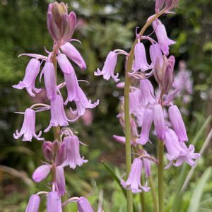 スパニッシュ ブルーベルのピンクの花が満開 釣鐘水仙、シラーカンパニュラータとも呼ばれ 我が家の花畑の奥で、秘密の花園になってます
