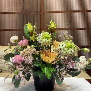 こんにちは😃 今回の生け花💐 背高ノッポのパンパスグラスさんは茎の部分をなるべく見せないように生けてみました🌾🌾 クッカパラちゃんはいつも位置づけするのに悩まされていますが、手直ししていただいて、いい感じに収まりました🥹