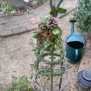 今日は、こんなの作って遊んでました☺️ 毎年恒例の『うちにあるものでクリスマス飾り』 今年はツリー🎄もどき🤭 材料は 柿の枝・野ブドウのつる ローズマリー・柊 南天・松ぼっくり 今年もタダで、クリスマス気分を楽しんでいます😂