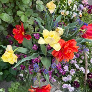 今日のお花チューリップ🌷 にぎにぎしい去年の写真から。 ①②毎年作るトリプルデッカーの鉢。 ③④原種チューリップレディジューンとペパーミントスティック。もうどっちがどっちか分からない。 ⑤珍しい青い原種チューリップ。今年は出てくるか微妙。 春が待ち遠しい。