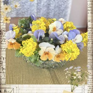 こんばんは✨ 今日も☀️で19℃で暑いくらいでした😲 ①徒長してきたビオラをどうしようかと悩んでいたら ②のように中の方から小さい若芽がでてきたので✂️して 貰った菜花も下の方がかれてきたので✂️して①のアレンジに🥰 ③ビオラ カルフォルニアコレクションが3色なので 2種のお花だけでも明るくなりました🥰🤍💛🧡💜💚💖 ④↖️植物園の温室で咲いていた 「ゴールド メダル」 という名前のレモンマリーゴールド💛 タイムリーな名前で5輪で沢山のメダル🏅おめでとう🎊 植物園の鉢植えで可愛い名前のパンジー みかんももか、ひよこももか、 これから立派になるのか タイガーアイオレンジ🐯 ↗️は冬越し組の2色目の黄色いオステオスペルマムが咲いて来ました💛 皆に元気貰いました💪 ↘️は友人から なかなか会えなかったので 遅くなったけどと10日前に頂いた手作りの干支の可愛い置物🥰と亡母の物たちで🤳☺️ 🏷️月曜はビタミンカラー 🏷️いつも心に太陽を 🏷️人に優しく 🏷️コラージュ仲間達 🏷️イロイロ参加させて下さいね☺️ 今日も一日お疲れ様でした😉 明日からも元気に過ごしたいですね( ͒ ु•·̫• ू ͒) ♡💕