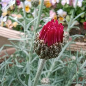 🍀おはようございます🍀 先日新しくお迎えした ローダンセマム リルピンク🩷 蕾は真っ赤❤️で可愛いけど ②③のpicのように 段々とピンク色に変化❣ ④そして…昨日パッ!と 開きました〜♪₍๐•ᴗ•๐₎ ⑤スプレーストックも急な 気温の上昇で咲きそうです♬