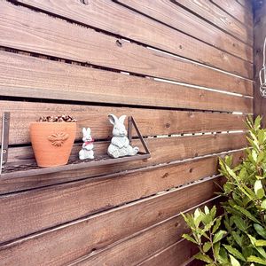 パーゴラに小さな棚を設置 見つけた棚が… アンティークゴールド色 あまりにギラギラ過ぎてチカチカするので 若干錆び気味のアイアンカラーに塗装してみた(◍︎´꒳`◍︎)