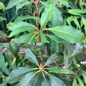 おはようございます😃 🏷️今日のお花 🍃🌿ユズリハ🌿🍃 新葉が出ると古い葉が場所を譲る様に落ちる事から名付けられました😊 子孫繁栄の象徴としてお正月🎍飾りにも使われます☺️ 大きな葉と赤い葉柄が特徴で、 雌雄異株です😄 ①ユズリハ 昨日の散歩道で出会いました😁 ②ガーデンシクラメンとカエル🐸 花が咲いてくれてますが、まだ蕾もあるのでもう少し楽しめそうです☺️ ③ツメレンゲ 左上、花が咲いた時です☺️ 左下、その後赤く紅葉しました😉 右、🆙で撮りました😄 ④チェリーセージ 寒さに耐えながらも花が咲いて ます😊 ⑤番外編 【環天頂アーク】 昨日の午前10時頃、雨が降ったわけでも無いのにうっすらと虹🌈の様なものが空に出てました😊 調べてみました🔍 大気光学現象で,太陽の上空(天頂方向)に現れる虹🌈の円弧の一部で、通常の虹🌈とは異なり、空に浮かぶ平たい六角板状の氷晶(小さな氷の結晶)によって太陽光が屈折する事で見られます☺️氷晶の六角形の面が水平に揃っている、特定の条件下で発生します☺️アーチの形が通常の虹🌈とは逆さに見える為「逆さ虹🌈」とも呼ばれます🤗 ②〜⑤ 私の庭にて❣️ 🏷️カエル🐸仲間 🏷️毎月6日はカエルの日🐸 🏷️カエルの日🐸 🏷️真っ赤な火曜日 参加します。