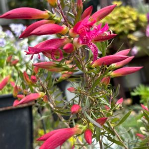 ①エレモフィラスイートルビー ちょっと変わった蕾と花で、赤い🎏のような形の花です。 花が開くと口をパクパク開けた魚のよう😳 蜜標のような斑点も見えます。 ✍️ オーストラリア原産の常緑低木。細い葉を茂らせるブッシュ状の株に、やや大きめのピンクの花を咲かせます。開花期間が数か月と長く、また関東以南なら戸外で冬越しするくらいの耐寒性があるので、ガーデニングや鉢植えにおすすめです。葉っぱを指で軽く擦り匂いを嗅ぐとフルーティーな香りがし 花が無くても一年中楽しめます。 ②PWのサンテブリテニア。 今は二、三輪しか花が咲いてないけど、冬は出窓で、育ててた時には、もう少し花が咲いてた。 繊細な枝なので、折れやすい。 ③チェリーセージ 古くからあって、これからたくさんの花が咲きます。 ④真っ赤な金魚草です。 ⑤シャーレーポピーの アメイジンググレイだと思ってたら、エッ(;゚Д゚)!真っ赤なポピーだった😲 誰⁉️ 近所の畑に咲いてるポピーと同じ😱 種飛んできた? 我が家にあったポピーは、天使の歌声とラズベリーリップルなので、そのどちらかならいいけど。