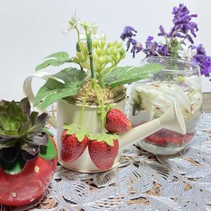 今日の🍓お花いちご🍓 寒い中アメジストセージ まだ咲いてます 下では新芽がお花つけてます 黒法師苺の容器に挿してみた 明日に全てカットして 鉢に挿しすつもりです 今が成長期なので…ね