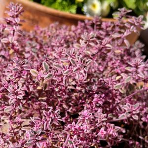 斑入りタイム(たぶん、シルバータイムかな?)が、こんなにキレイに色付きました✨ 2枚目は、1/17の様子📷️ この時は、まだうっすらとした色付きです 1月下旬の寒波のためか、急にピンクが濃くなったみたいです💗