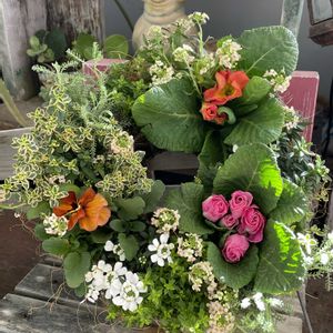 こんにちは 今日は晴れたり曇ったり? 昨日は早朝より代休日でお休みだった孫娘2人のお守りに~ 下3歳が熱の為…冷や冷や🤣 高熱にならず37°代で落ちついてくれていたのでホッ😮💨 娘が仕事から帰るまで長〜い1日でした😅 今日は昨日の雨で落ちた枯葉🍂 のお掃除🧹後、自治会の配り物📬他 やっと溜まったお仕事を終える事ができました😌 お迎えした苗で一つだけ植え込んだハンギングです♪ この時期惹かれてしまう赤いガーデンシクラメンと白いカルーナと斑入りタイムのシンプル寄せ植えです😉🎶