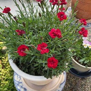 ダイアンサスとは、撫子(なでしこ)の事だったんですね〜💕 ダイアンサス フルーリーアムール ルージュ が、やっと 回復❤️🩹、 ほんと 真っ赤🔴な色です❣️^_^ 冬の間じゅう、このダイアンサス 消え入りそう〜だったのが、ここまで 回復❤️🩹したのが、嬉しいです ‼️🥹 2枚目 鉢植え🪴のゲラニウム🌸 こじんまりと 1鉢 あります❣️ だんだん 咲いて来ますよ、もう〜 すぐです‼️ 淡い、薄いピンク色🌸です、咲けば また、投稿しますね❗️ 3枚目 絹さや 去年 植えたのが 、収穫期で 最近 ちょこ ちょこ 獲れてます❗️ 4枚目 九条ネギの苗が 売ってたので、植えてみました〜❗️ 広くは無いので、このぐらいが うちのサイズ、小さなプランターに! 5枚目は ミントで、ストロベリー ミントさん💕 ただ 私には ストロベリーの香りが 分からない..... 鼻が 悪いのかなぁ〜💦 あまり 香り、私には 感じられないけど、ミントの中でも 葉っぱ🌱が 小さいのが 気に入った。。。 今日は 良き天気☀️でした、神様 ありがとう😊〜🌸♪