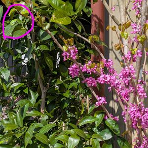 今日も晴れています🤗 〜今日のお花〜 『ハナズオウ』 まだ満開です💘庭パト中に上をみるとシークワーサーの葉に🐸ちゃんが👀😆 GS繋がりの花友さんにシークワーサー頂けたので冬越しして育てています🤭 1️⃣ハナズオウ&シークワーサーの葉に🐸ちゃん(@_@;) なんとなく気づくんもんですね👀😆 2️⃣3️⃣写真撮る間に🐸ちゃんがおひさまにお尻を向けてました😁 4️⃣親ハナズオウの木の側には子どものハナズオウの木が生えてこちらも花を咲かせています😍 前方のミントの茎が太いけど🤭 5️⃣カタバミの白が仲間入り🤗
