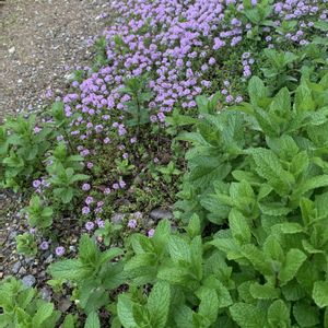 おはようございます〜 今日は雨が止んで晴れました☀️ 畑の横のクリーピングタイムが満開でコラボしたミントも元気に育ってきました、元気すぎないようちょこちょこ✂️してます💚💜💚💜💚💜