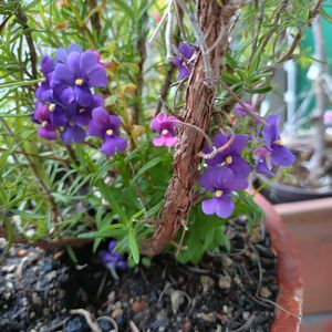 4/1 寄せ植えの植えっぱなしローズマリーの根元でネメシアが咲いています♪ ここだけ土の入れ替えがないからですかね〜
