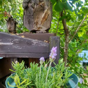 コンクリートの隙間で花咲く ラベンダーの遺伝子手に入れました ご近所さんちの種が飛んだらしく秋に少しちぎって頂きました 未だ 赤玉土のまま…ド根性に育ってほしい
