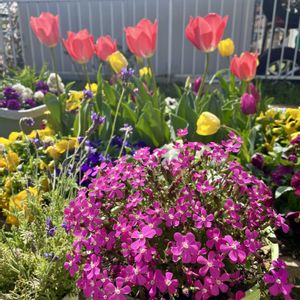 道路沿いの花壇にて色んなお花をパチリ!📸😄🤗🌞✌️ ①②ベニバナトキワマンサク♥️ ③シバザクラ🩷🌿 ④⑤フレンチラベンダー💜🌿
