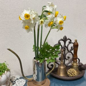 寒い😨ですね〜、パンジーや ビオラばかりなんですが、、、 そう〜だ🌼 ニホンスイセンが 庭の端っこに 咲いていました❣️ 切って来ましたよ💓🎶 外の庭は 陽射しは 春に向かっていますが、 寒い😨ので 今日は 室内から失礼します。。。 暖房つけてますが、室内着に もう 1枚、ジャンパーを 羽織ると 、 やっぱり 暖かいですね❣️ テキパキ動いて、いろいろ動きたいのは 頭の中に ありますが、極寒の2月..... 寒さ❄️の所為に しときます〜‼︎‼︎💦