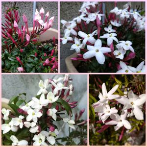 GS今日のお花 ♡ジャスミン♡ ①…ハゴロモジャスミンのハンギング お気に入りのpic☺️ ②…マダガスカルジャスミン 今年は葉っぱがなくなったまま… ✨😇になったのかも…😢 ③→⑤ バラ咲きジャスミンの色の変化 すべて過去picです