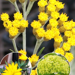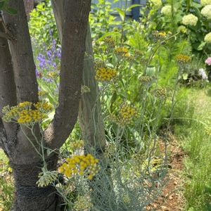 6月上旬 ☁ カレープラント、やっと黄色いお花が咲いてきました🟡 ちいさなポンポンみたいな花が、シルバーリーフのてっぺんにちらちら。 少しミモザっぽい雰囲気もあって😃 これがあの「イモーテル」=永久花だったとは…! 化粧品のコピーで見かけた“永久花の生命力を、肌へ。”って、なんだか効きそう〜って思っちゃう💫 香りは、ほんのりふんわり…カレー🥄 朝の水やりでふわっと香ると、ちょっとお腹がすいてくる😆 スープに入れてみたこともあるんだけど、 正直、味はイマイチでした🫢 使い方が良くわかりません。 ドライフラワーにも向いてるらしいので、 ミモザっぽくなるかな?と期待しながら、干してみます🧺✨