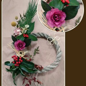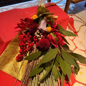 お正月の玄関飾りと、生花のアレンジを作りました。 皆んなでワイワイと楽しく作りました。 良いお年をお迎えください! ・お正月玄関スワッグ レモングラス、ユーカリ、 古代米(夕焼けもち)、南天 おたふく南天、ナンキンハゼ、 キンカン ・アレンジメント マム(マノア)、ピンポンマム、 松、アルストロメリア、 ケイトウ、キルタンサス、 バラの実