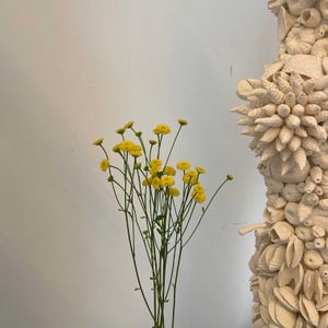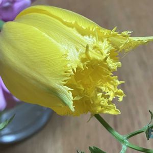 チューリップ 黄色 端がギザギザ 2週間前に蕾でとどきましたが ようやく開花 その他ガーベラは約ひと月前から 長持ちしました。 茎を短くして飾りました。 ただ チューリップがダラリとなる為 マトリカリアに寄りかかってます。 チューリップ 『お世話になります』 マトリカリア 『良いよ』 そんな会話している