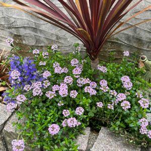 春は庭パトが楽しい𓏸𓈒 𓂃🌼.* ① タイム ロンギカウリス コルジリネの下がピンクで華やかに🩷 ② スパラキシス ③ ラナンキュラス ラックスグレーシス 満開🤗🎶 ④ マトリカリア こぼれ種から~ ⑤ ワスレナグサ こぼれ種から~